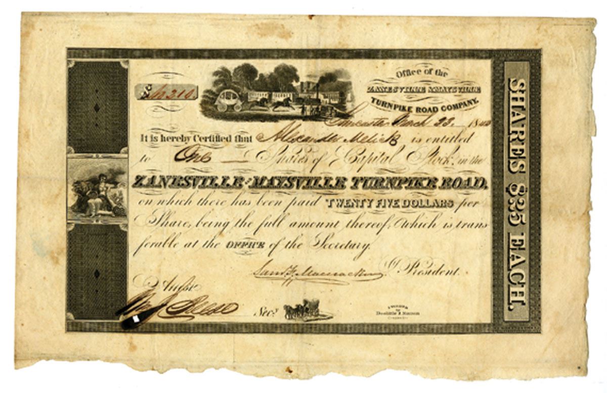 Ohio, 1843. 1 Share I/U Capital Stock Certificate, Black print with black border and stage coach and train at top center, Certificate is in VF to Choice VF condition with a small ink burn on the lower left corner. The Zanesville-Maysville Turnpike Road was located in Ohio. The road followed the general alignment of a historic pathway known as Zane's Trace, which was the first road built through Ohio, authorized by an act of Congress in 1796. Cities: The route connected Wheeling (now in West Virginia) and Zanesville, Ohio, and continued toward Maysville, Kentucky, passing through Ohio cities like Lancaster and Chillicothe. Modern Alignment: Portions of the turnpike's route later became known as the Aberdeen & Zanesville Turnpike, and the general path is paralleled by segments of modern U.S. Route 40. Ornate intaglio engraving by Doolittle, Ivy & Munson, Cincinnati.