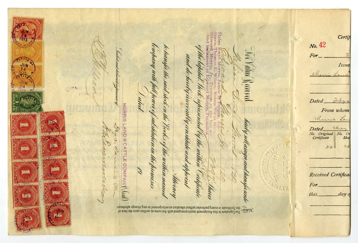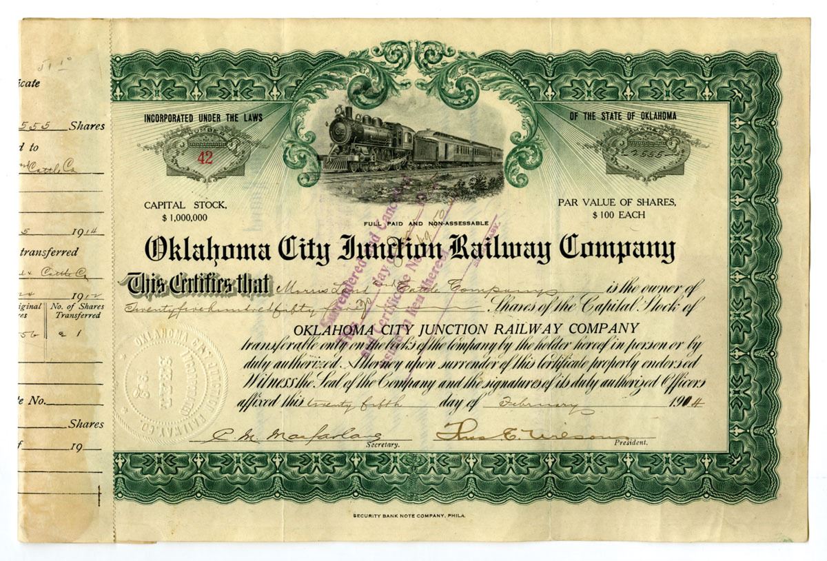 Oklahoma, 1914. 2,555 Shares Capital Stock I/C Certificate, Black print with green border and train vignette at top center above company title, S/N 42, Stamp stating pay out terms at center, Reverse has $51.10 worth of International Revenue stamps, Fine to VF condition. SBNC.