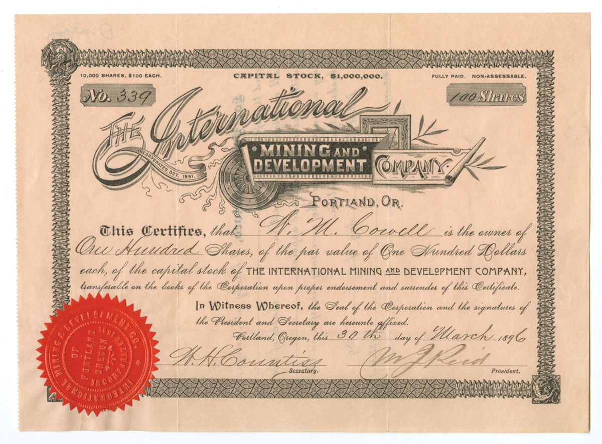 Portland, Oregon, 1896. 100 Shares Capital Stock I/U Certificate, Black print on prink paper, Company title at top center with bright red seal at bottom left corer, S/N 339, VF to XF condition.