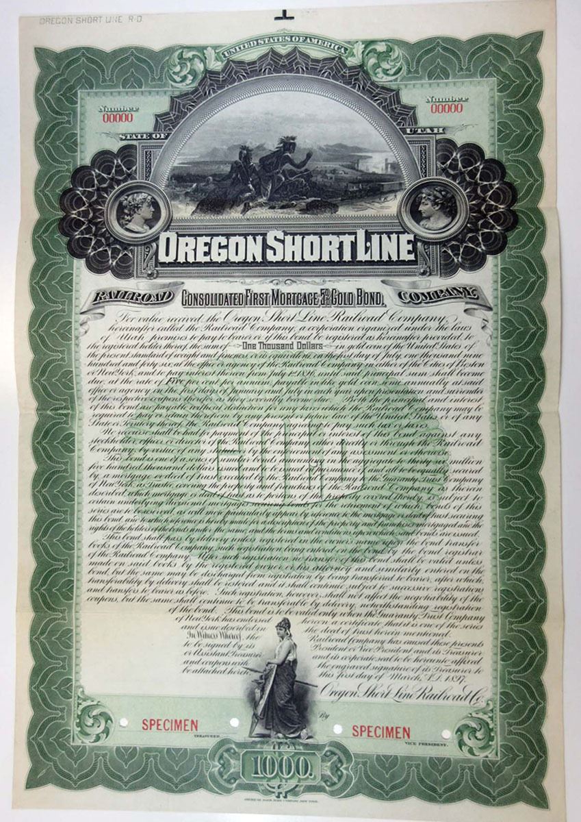 Oregon, Specimen $1000 Consolidated Registered 1st Mortgage 5% Gold Bond (Missing the coupons). Green border. Native American Indian "Progress" vignette viewing railroads and cities on top and allegorical "Liberty" holding spear and shield on bottom. Red specimen overprints, POC's and "00000" serial numbers. XF condition. Only listed as a specimen in Cox, no issued examples known and 1 of 3 found in the American Bank Note Archives in 2002. This is the only one available.