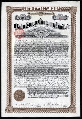 Honolulu, Hawaii. 1906. $1000. 5% Gold Bond. Issued and uncancelled. Brown border. Ornate title, no vignette. German imprinted revenue stamp in red on UL. No coupons. XF. Rare Hawaiian Sugar company.