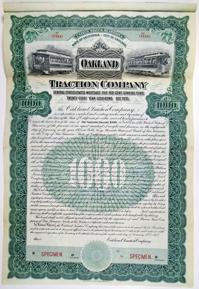 California, 1907. $1000 Specimen 5% General Consolidated Mortgage Sinking Fund Gold Coupon Bond, Black text with green border and undertint, Pair of streetcars flank top left and right. Red specimen overprints, 00000 serial numbers, and POCs. VF condition, ABNC. Only bond listed for this railroad in Cox, and only listed in specimen format. Rare. This is one of 2 examples found in the ABN Archives.
