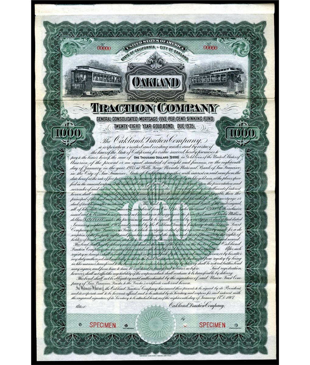Oakland, CA. $1000 General Consolidated Mortgage 5% Sinking Fund Gold Coupon Bond, Electric street cars flank title, Green border, XF, ABNC. Unlisted railroad in Cox.