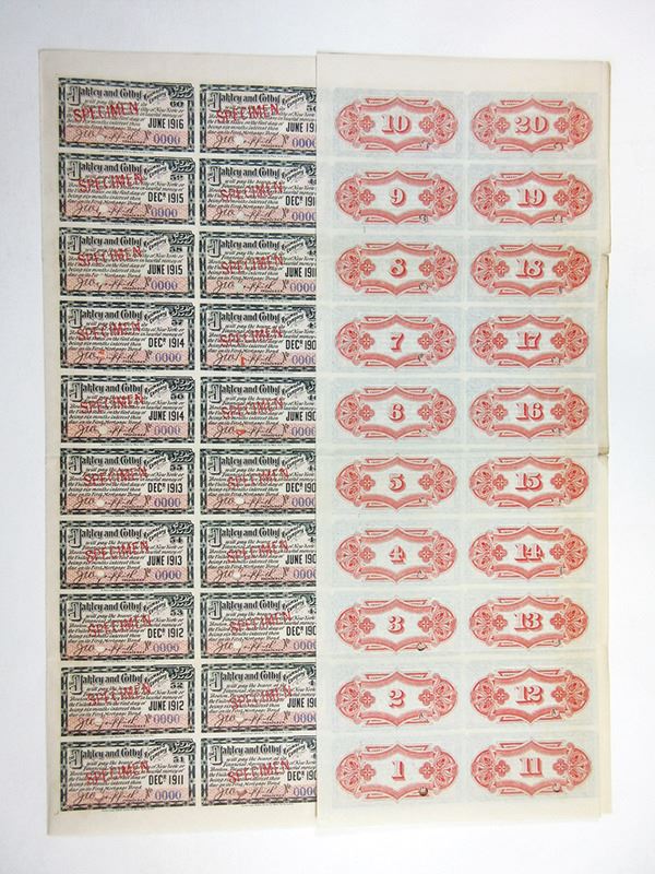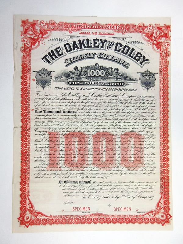 Kansas. $1000 Specimen 5% First Mortgage Coupon Bond, Black on red border and under tint, Cherubs flank denomination under curved title on top, Specimen overprints and POC's, VF condition, ABNC. Only one example of a stock certificate known previously, there are no known examples of this railroad as a bond which is possibly unique. ABNC.