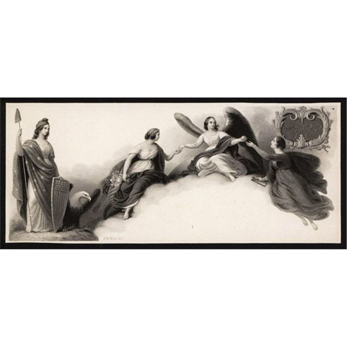 ND (ca. 1840-50's), 7.25 by 3 inches, Standing Liberty with, eagle, shield, flag and Liberty Cap with staff on left, angel on middle right reaching to allegorical women with counter on upper right, black on india paper on thin white card, glue remnants on back, XF condition, Scarce and very attractive Obsolete Banknote Vignette, R.W.Wier, del, imprinte on bottom left margin, probably a RWH or related engraving.