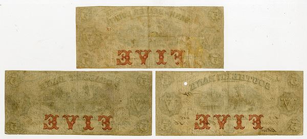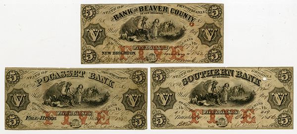 Bainbridge, GA. Fall River, MA. & New Brighton, PA. Lot of 3 notes with the same design. The Southern Bank of Georgia was incorporated in 1856 and failed in 1859. The GA note is genuine. The MA and PA notes were altered from the GA note. BC&C-BB&C. Choice VG to Choice Fine. (3)