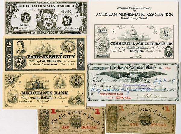 Includes 2 $1, City Council of Augusta, Georgia Obsolete scrip Notes, VG-Fine; Reprint Intaglio proofs by ABN of Obsolete Banknotes and Miscellaneous items. Sold "AS IS", no returns accepted.