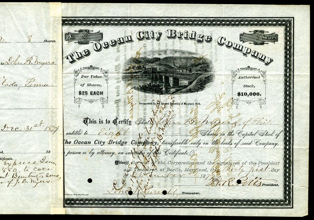 Berlin, Maryland, 1879, Ocean City Bridge Co. 8 Shares, $25 Stock Certificate, VF Condition.