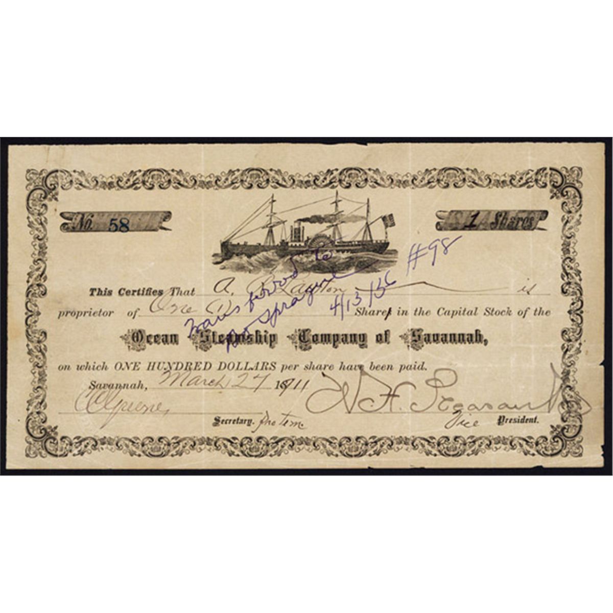 Savannah, Georgia, 1911, 1 Share, #58, I/U stock certificate, Black with Steamship vignette, VF condition. Scarce later date usage.
