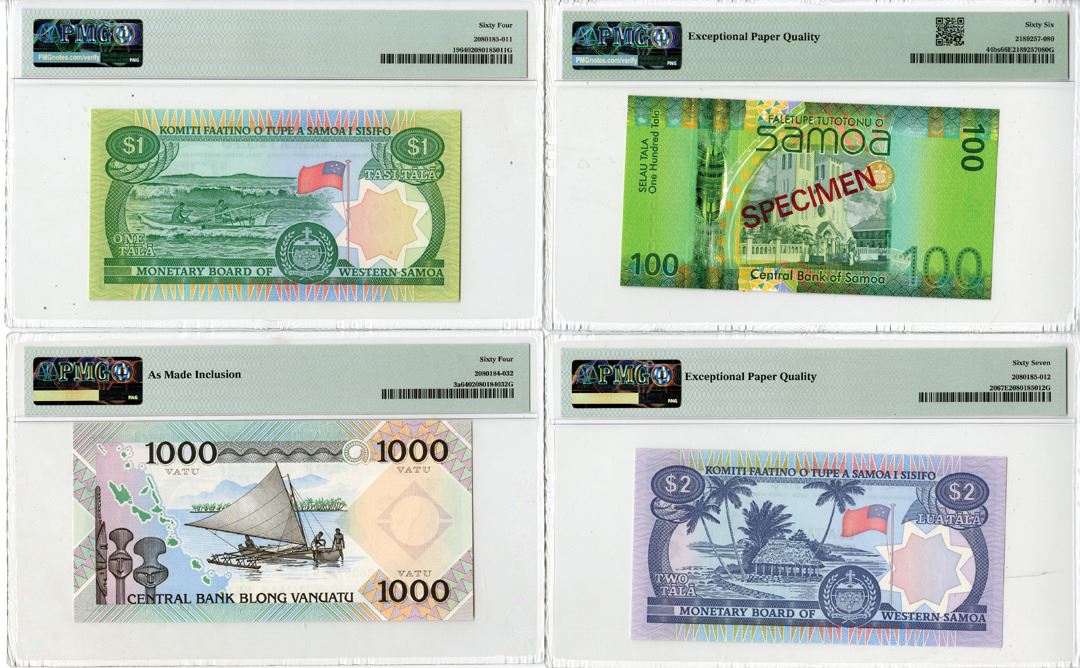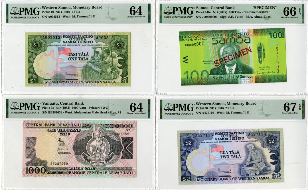 Vanuatu, Western Samoa, Samoa, ND (1980) - ND (2017). Lot of 4 Issued and Specimen Banknotes, Includes: Central Bank of Vanuatu 1000 Vatu, P-3a, Issued Banknote, PMG Choice Unc 64 with comment "As Made Inclusion"; Monetary Board of Western Samoa 1 Tala, P-19, Issued Banknote, PMG Choice Unc 64; 2 Tala, P-20, Issued Banknote, PMG Superb Gem Unc 67 EPQ; Central Bank of Samoa 100 Tala, P-44bs, Specimen Banknote, PMG Gem Unc 66 EPQ. (4). Sold "AS IS" no returns accepted.