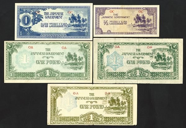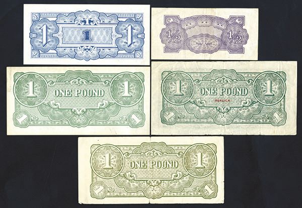 Oceana, Lot of 5 notes, Highlights include Oceania, Australian "REPLICAS" pair, ND (1943), £1, P-R4, with modified blue guilloche, VF and £1, P-R5, Black without overprint, VF. Also included are Oceania, P-1c; 2a and 4a in VF to Uncirculated. Scarce Australian Replica reprints reportedly made in Australia. (Silicon Valley Collection).