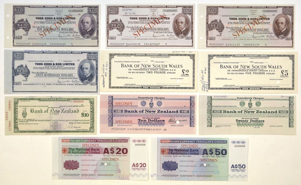 Oceania, ND (ca.1950-80s). Lot of 11 Specimen Checks, Includes: Bank of New Zealand (3) for 10 Pounds, 10 Dollars, and 20 Dollars; Bank of New South Wales for 2 Pounds and 5 Pounds; Thomas Cook & Son Ltd., for 10 Dollars, 20 Dollars (2), and 50 Dollars; National Bank of Australasia Ltd., for 20 Dollars and 50 Dollars. Checks have Specimen overprints and POCs, and range from XF to UNC condition. (11). Sold "AS IS" no returns accepted.