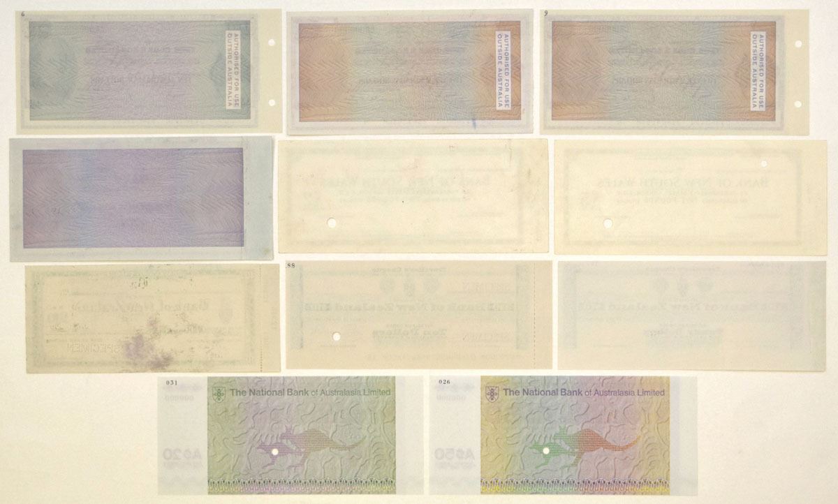 Oceania, ND (ca.1950-80s). Lot of 11 Specimen Checks, Includes: Bank of New Zealand (3) for 10 Pounds, 10 Dollars, and 20 Dollars; Bank of New South Wales for 2 Pounds and 5 Pounds; Thomas Cook & Son Ltd., for 10 Dollars, 20 Dollars (2), and 50 Dollars; National Bank of Australasia Ltd., for 20 Dollars and 50 Dollars. Checks have Specimen overprints and POCs, and range from XF to UNC condition. (11). Sold "AS IS" no returns accepted.