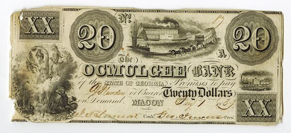 Macon, Georgia, $20, Issued obsolete, Black without underprint, steamboat with wagon of cotton passing, allegorical women on left, Appears Fine but the lower and upper left corner tip is missing, a couple of small tears on the left margin and a thin on the upper left are visible. Low S/N 89, Scarce note. RW&H. (ex- Jack Guevrekian Collection/NASCA, 1977).