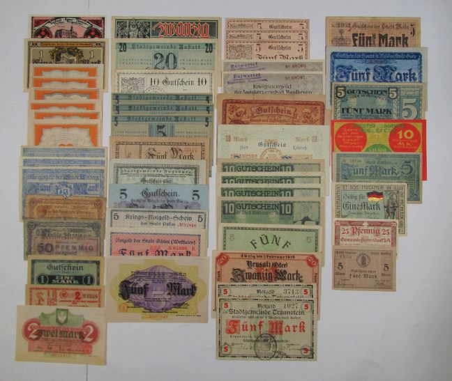Germany…..,., 1918-21. Lot of 52 inflation banknotes from Odenwald, Schobull, Rastatt, Bielefeld, Muhlhausen, and many others. Sold "As Is" No Returns accepted. (52)