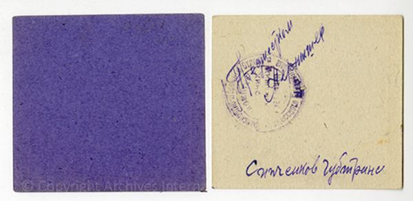 Russia (Ukraine). Lot of 2 notes, includes 50 Kopeks and 10 Kopeks from the same issue. Both uniface and printed on thicker paper. Both with validation handstamps. The 10 with an additional handstamp reading "Chervontsy" (as opposed to Rubles or Kopeks). Very Fine to Extra Fine.