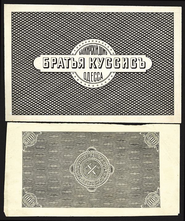 Ukraine. Ink and pencil on card stock. Odessa Banker's House - Brothers Kussis. 10-1/2 x 7 inches. As made; Proof of underprint for 300 denomination. Hermes Partnership. Irregular paper edge, Choice Very Fine. 2 pieces.