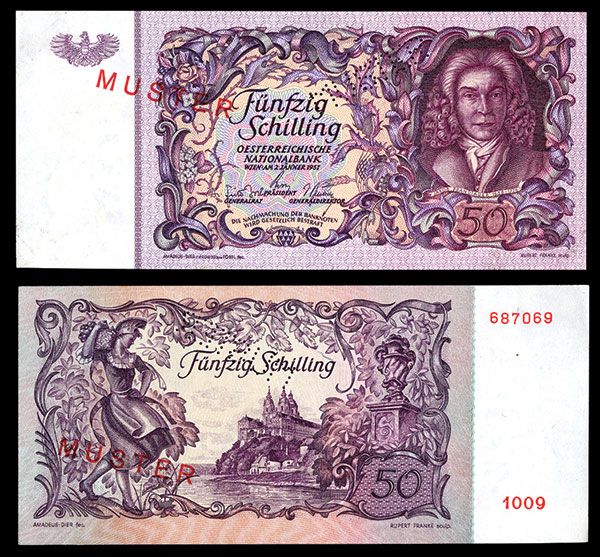 Austria, 1951, 50 Schilling, P-130 Unlisted Specimen, Lilac on violet, Muster overprint in red and pin punch Muster, Uncirculated, Scarce as specimen.