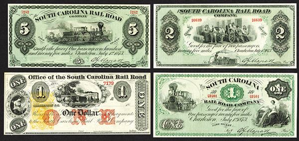 SC. Steam trains on all. The last group with bold green underprints and green backs. All Uncirculated. 4 pieces.