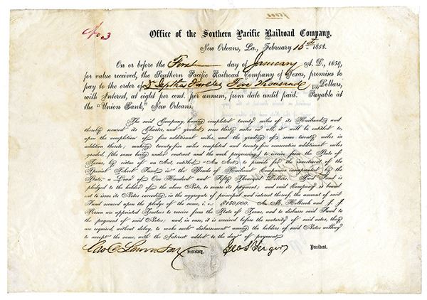 New Orleans, Louisiana. $5000 8% Bond, Black print on large sized certificate without any border or vignette, Very low certificate Serial #3, VF condition. Back has printed that the bond will be paid when $150,000 is received from the State of Texas. Rare and unlisted in Cox.