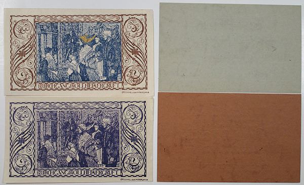 Germany & Austria. Lot includes a pair of 5 and 10 Mark uniface POW camp scrip notes, dated 19xx?; also from the Austrian town of Wels a pair of 90 Heller Notgeld of the same design but in two different colors. XF to About Unc.