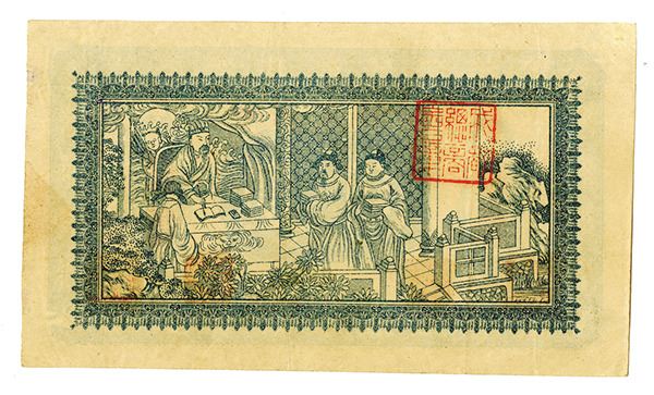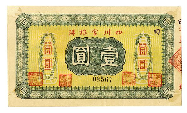 China. A 1 yuan banknote issued by the Official Bank of Sichuan province. ND (ca.1930-40's). There is no main figure on the face but only denominations and seals. The four seals from right to left are of: Governor of Sichuan Province; Commander-in-Chief of the Sichuan Army; Commander-in-Chief of the Anti-Rebel Army; Manager of the Bank. The back side features daily lives of traditional Chinese scholars. The seal on the back is of the General Chamber of Commerce of Chengdu. _____________________________________________________________________________________________________