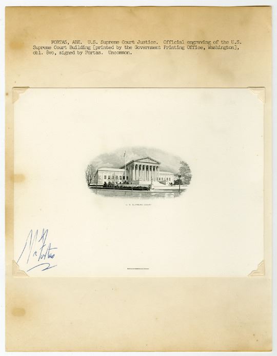 Washington, D.C., ca. 1960s. Official Engraving of the U.S. Supreme Court Building, printed by the Government Printing Office in Washington, with Bureau of Engraving and Printing imprinted at bottom center, with Supreme Court Justice Abe Fortas' signature at bottom left. The engraving is intaglio printed in black and mounted on paper at the corners. Abraham Fortas (June 19, 1910 - April 5, 1982) was an American lawyer and jurist who served as an associate justice of the Supreme Court of the United States from 1965 to 1969. Born and raised in Memphis, Tennessee, Fortas graduated from Yale Law School. He later became a law professor at Yale Law School and then an advisor for the U.S. Securities and Exchange Commission. Fortas worked at the Department of the Interior under President Franklin D. Roosevelt, and was appointed by President Harry S. Truman to delegations that helped set up the United Nations in 1945. In 1948, Fortas represented Lyndon B. Johnson in the hotly contested Democratic senatorial second primary electoral dispute, and he formed close ties with the president-to-be. Fortas also represented Clarence Earl Gideon before the U.S. Supreme Court, in a landmark case involving the right to counsel. Nominated by Johnson to the Supreme Court in 1965, Fortas was confirmed by the Senate, and maintained a close working relationship with the president. As a Justice, Fortas wrote several notable majority opinions including Tinker v. Des Moines Independent Community School District. In 1968, Johnson tried to elevate Fortas to the position of chief justice of the Supreme Court, but that nomination faced a filibuster and was withdrawn. Fortas later resigned from the Court after a controversy involving his acceptance of $20,000 from financier Louis Wolfson while Wolfson was being investigated for insider trading. The Justice Department including future Chief Justice William Rehnquist investigated Fortas at the behest of President Richard Nixon who saw the idea of removing Fortas as a chance to move the Court in a more conservative direction, and Attorney General John N. Mitchell pressured Fortas into resigning. After retirement, Fortas returned to private practice, sometimes appearing before the justices with whom he had served. Fine condition with some toning and staining.