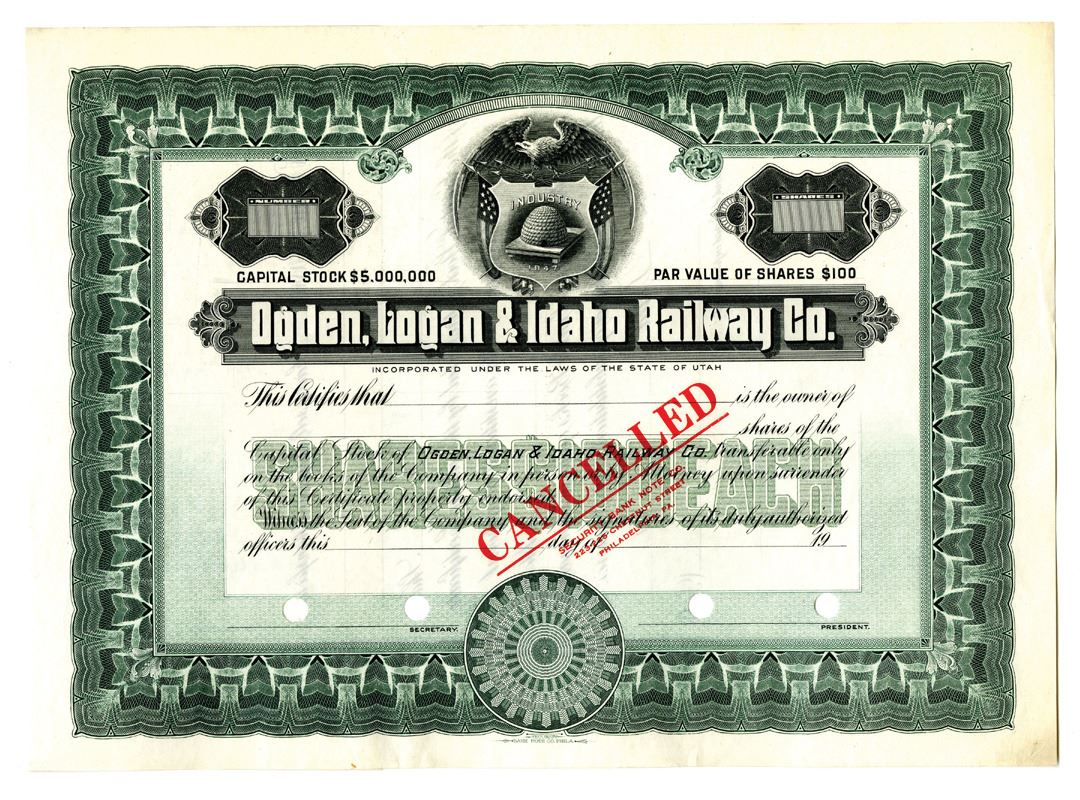 Utah, ND (1900-20s). Odd Shares Specimen Capital Stock Certificate, Black text with green border and underprint, Utah state seal depicted at top center. Red cancelled overprint and POCs. XF condition, SBN.