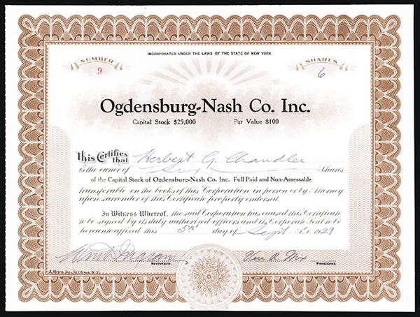 New York, 1929, Horizontal 6 Shares, #9, Issued and Uncancelled Stock certificate, Brown border with Clouds Sun rays vignette underprint, Company Seal, XF. Possibly a car dealership.