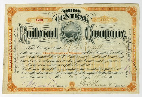 Ohio, 1882. 100 Shares, I/U Capital Stock Certificate, Black text with orange border and undertint, Ohio state seal at top. Fine-VF. Unlisted as I/U, only as Cancelled condition, some discoloration signs of wear, FBN.