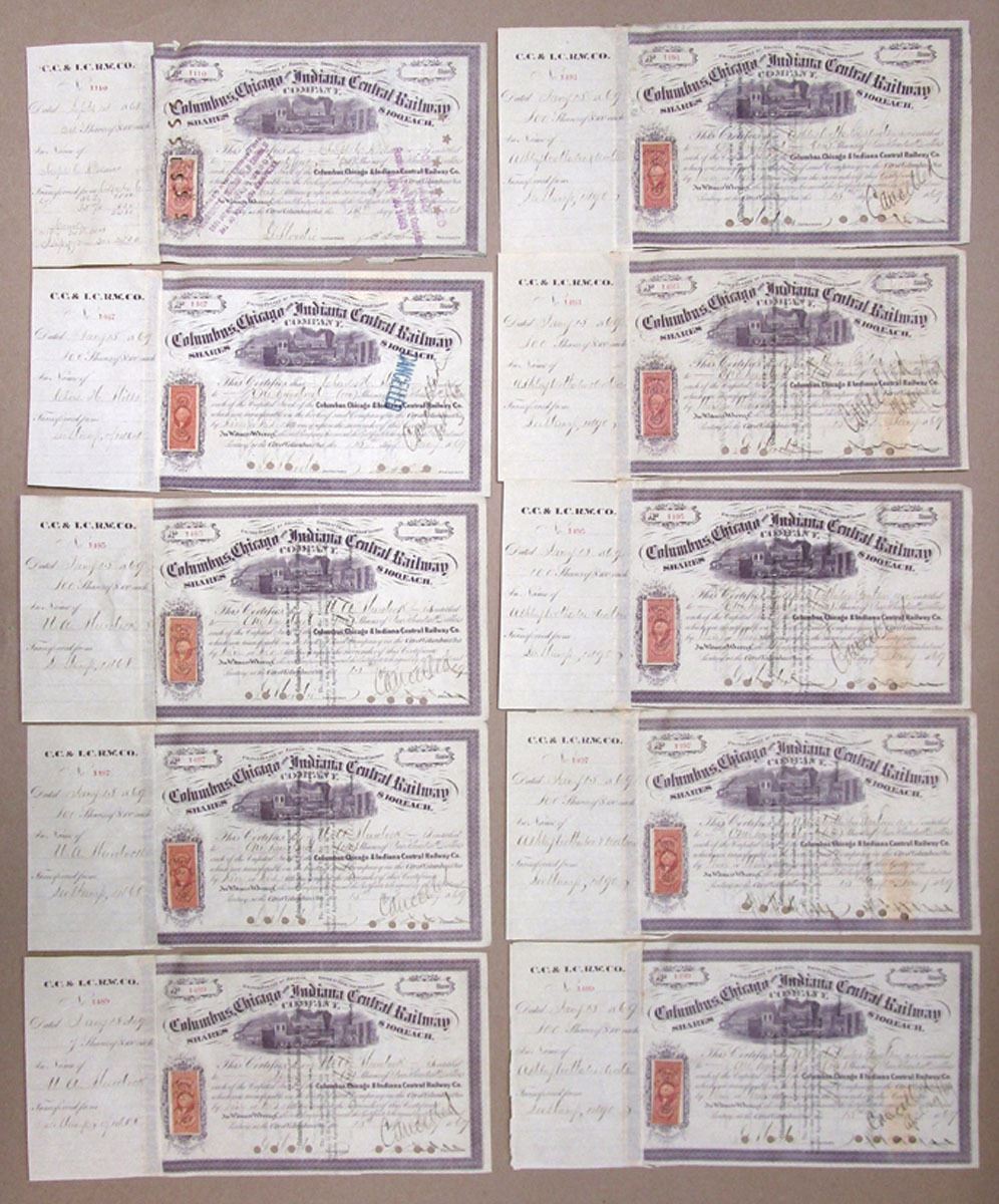 Ohio, Indiana, & Illinois. Columbus, Chicago and Indiana Central Railway Co., 1868-69, Lot of 10 I/C
