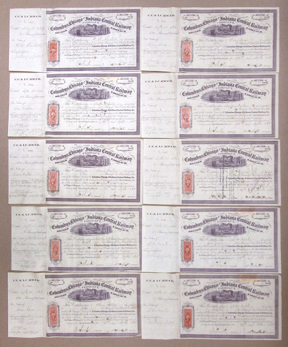 Ohio…., Indiana, & Illinois, 1868-69. Lot of 10 I/C Stock Certificates for Varying Shares, All have purple print and border with locomotive at center under title, Revenue stamps at left, Choice Fine-VF+ condition. (10). Sold "AS IS" no returns accepted.
