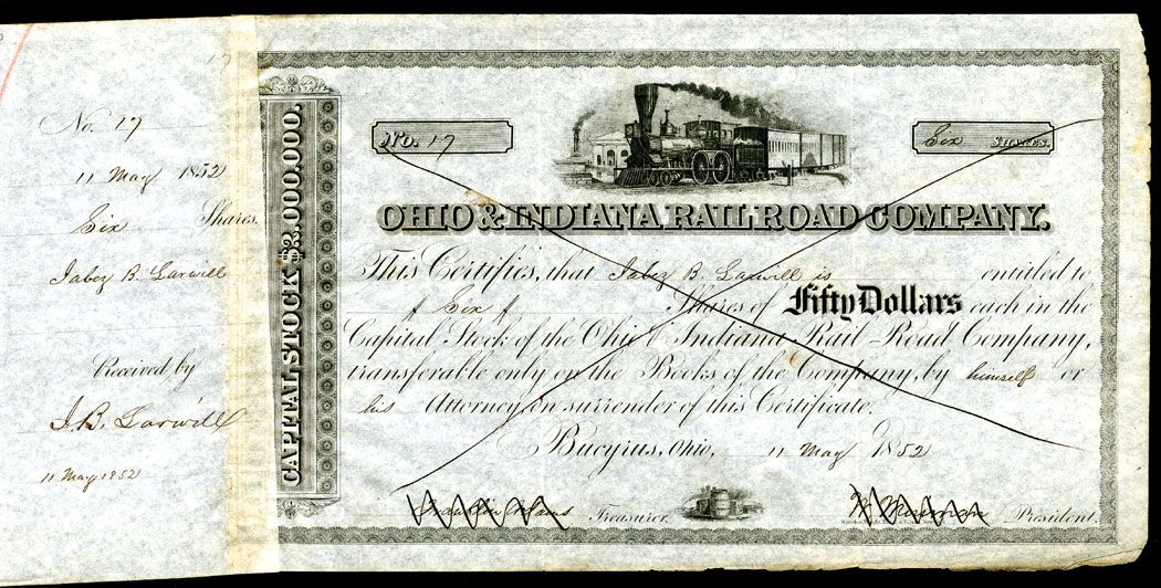 Bucyrus, Ohio, 1852, Ohio & Indiana Railroad Co. $50, 6 Shares, Stock Certificate, VF Condition. RWHE.