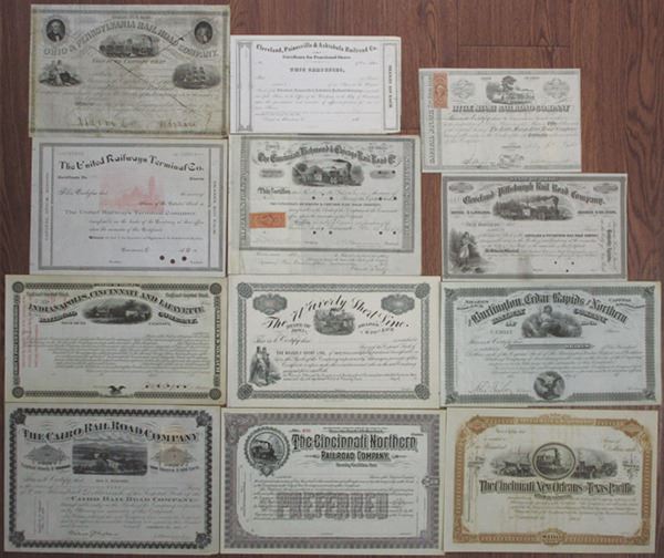 Ohio. Iowa...... New York, 1855-1907. Lot of 12 railroad stocks and bonds from the Midwest, highlights include: Little Miami Railroad Co.; Cleveland, Painesville & Ashtabula Railroad Co.; Ohio & Pennsylvania Rail Road Co.; United Railways Terminal Co.; Indianapolis, Cincinnati and Lafayette Railroad Co.; Waverly Short Line; Cincinnati, New Orleans and Texas Pacific Railway Co.; and Cairo Rail Road Co. All are in Fine-VF condition. (12)