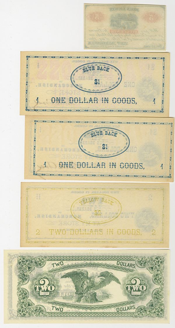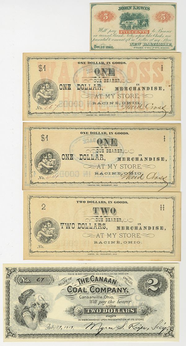 Ohio, Lot includes $2 from Canaanville, OH issued by the Canaan Coal Co., Unc; 5 Cents, 1862 from New Baltimore, OH issued by John Lewis, AU+; and a trio of $1 and $2 store scrip notes from Racine, OH, unissued and Unc.