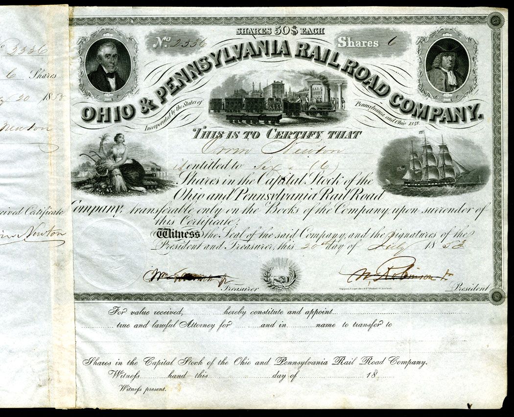 Ohio, 1853, Ohio & Pennsylvania Railroad Co. 6 Shares, $50, Stock Certificate, VF Condition. TCC.