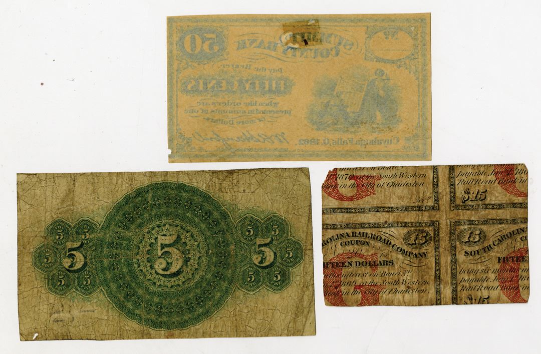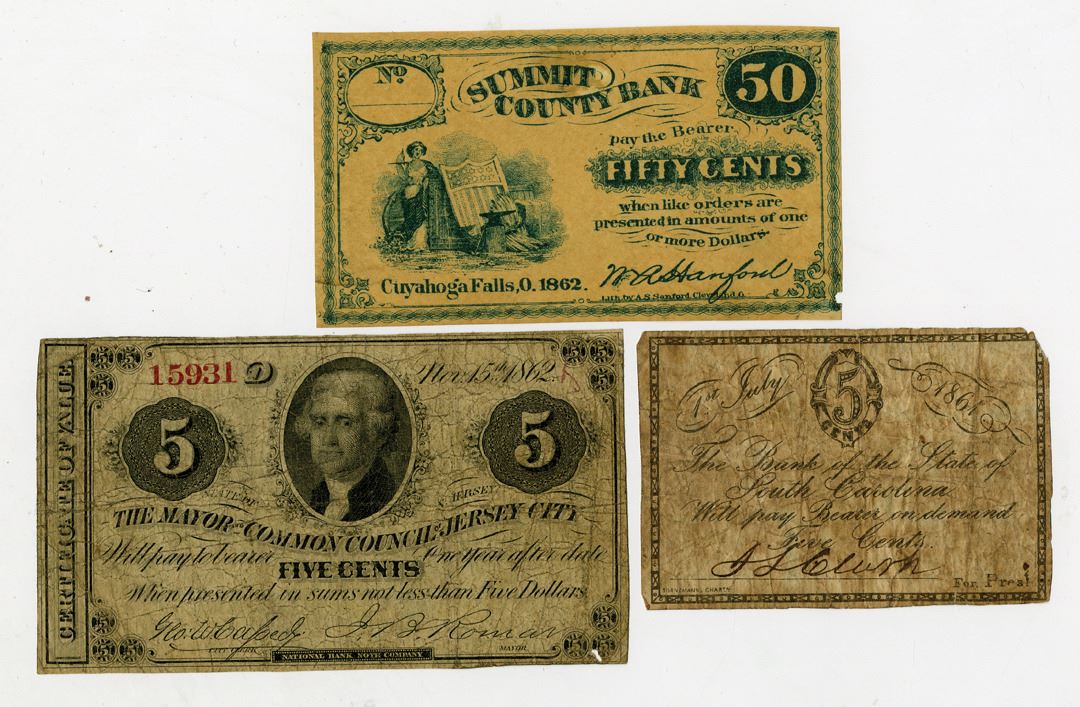 New Jersey, Ohio and South Carolina. Lot of 3 obsolete Scrip Notes. Includes 1862, NJ. 5 cts, Mayor and Common Council of Jersey City, Issued, VG-Fine, NBNC; 1862, Cuyahoga Falls, OH., Summit County Bank, 50 cts, Remainder, XF-AU, toning; and, SC., 1861, Bank of the State of South Carolina, 5 cts, VG. (3 Notes).