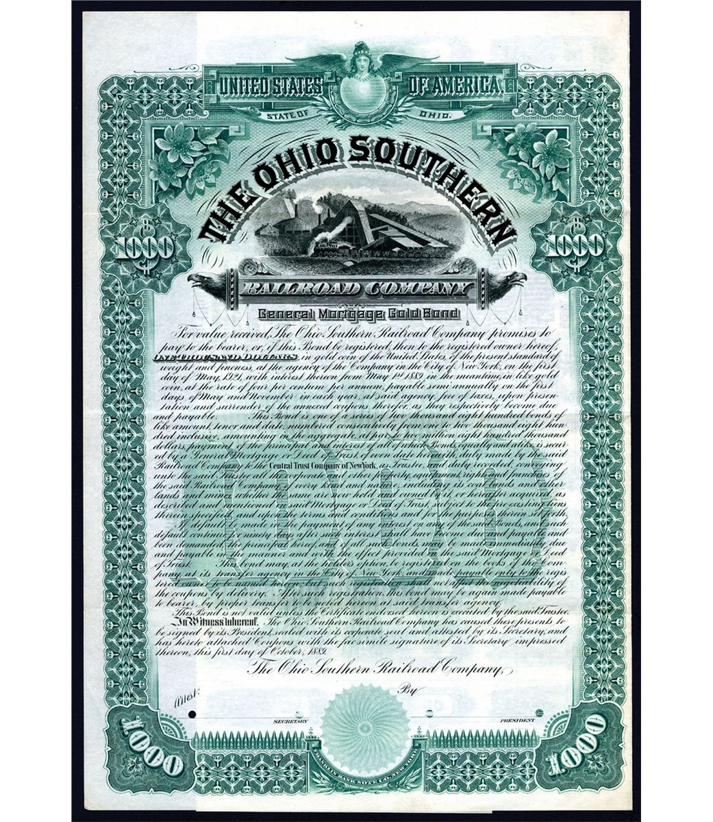 Ohio. 1889, $1000 General Mortgage 4% Gold Coupon Bond Specimen, Black on green border and underprint, Coal or ore train passing factory top center, POC's, VF condition, FBNC. Rare railroad.