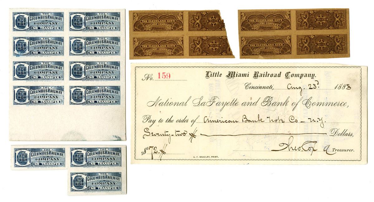 Cincinnati, Columbus, and Cleveland, Ohio, ca.1880s. Lot of 5 different items including 2 sheet pairs of uncut proof tickets for the Cleveland City Railway Company, each printed in brown ink on card stock of the front and back in a side by side position with elaborate scrollwork and rosettes surrounding the company’s name, with blank backs, printed by T.A. Bradley; Columbus Railway Company, Uncut Block of 10 and an uncut block of 3, all uniface, fare ticket proofs, printed in blue with "No Transfer" text and trolley vignette, printed by Security Bank Note Co., Phila.; and, a Check issued by Little Miami Railroad Co., dated August 23, 1883, made out to American Bank Note Company in the amount of $72.00. Items range from VF to Uncirculated condition. (5).
