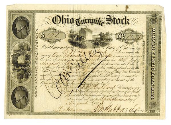 Ohio. $120 Cancelled 6% Stock Certificate, Black print on black border, Multiple images on certificate at top and along left margin, Cancelled written across page, Fine-VF condition with minor stains, Rawdon, Wright & Hatch.