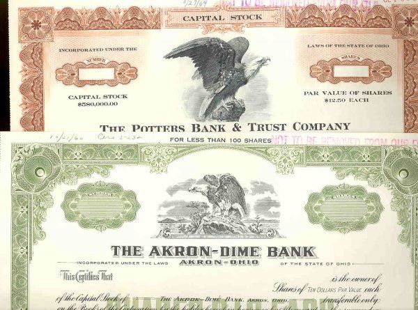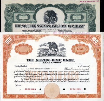 ca.1920's-30's. 4 different specimens. Banks include: Society Savings and Loan Company; Potters Bank & Trust Company; Akron-Dime Bank (2). Scarce Akron, Ohio bank stocks (one is from East Liverpool, Ohio). SBNC, SCBNC.