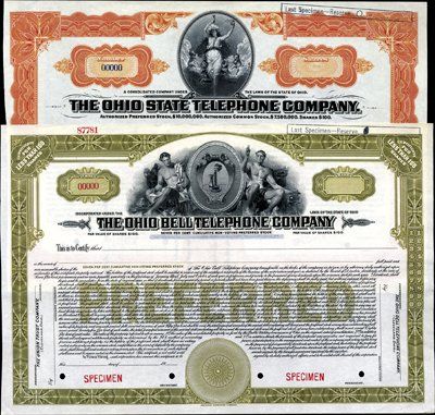 ca.1900-1920's. 2 different specimen telephone company stocks. 1). The Ohio State Telephone Co. Allegorical woman holding antique telephone over her head. Orange border. Odd shares; 2). The Ohio Bell Telephone Co. Vignette of allegorical men flanking antique telephone. Olive green border. <100 Shares. Both in XF condition. Red specimen overprints, POC's and "00000" serial numbers. Scarce Ohio Telephone companies. ABNC