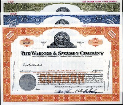 ca.1930-50's. <100; 100; Odd Shs. 3 different specimen stock certificates. All are different colors and share amounts. All have vignette of award medal with allegorical man with telescope on top middle and corporate seal on the lower left with a representation of the "Lick" telescope. Red or blue specimen overprint, POC's and "00000" serial numbers. XF condition. Well known Ohio telescope maker. Scarce certificates. FL-ABNC.