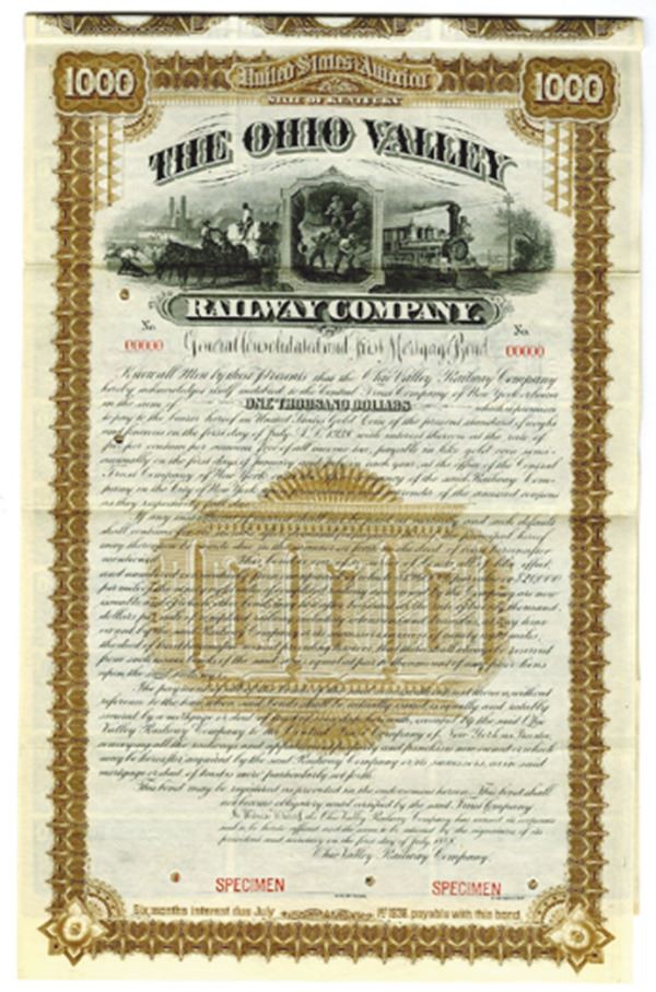 Kentucky. $1000 Specimen General Consolidated and 1st Mortgage Coupon Bond, Black print on brown border and under tint, Miners, farmers, and locomotive at top, Specimen overprints and POC's, VF-XF condition, ABNC.