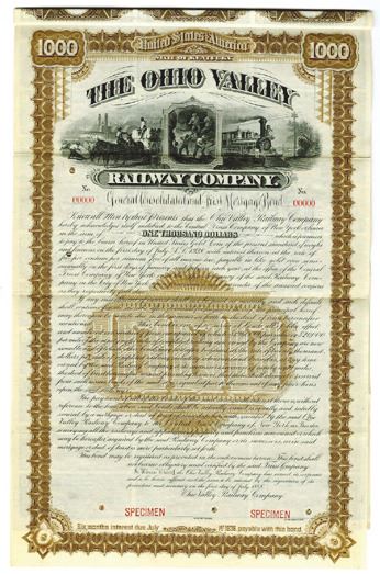 Kentucky. $1000 Specimen General Consolidated and 1st Mortgage Coupon Bond, Black print on brown border and under tint, Miners, farmers, and locomotive at top, Specimen overprints and POC's, VF-XF condition, ABNC. Only 3 examples found in the ABN Archives in 2002. This is the only example available and is the exact bond pictured in Cox with the image from our company.