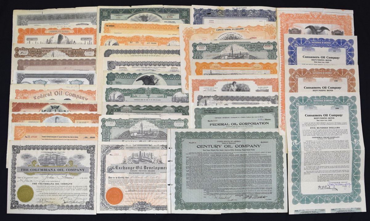 Various States..., ca. 1910-40s. Lot of 30+ certificates from various oil and gas firms, including both issued stocks and corporate bonds. Highlights include: The Columbiana Oil Company; Columbia Oil & Gasoline Corporation; Cherokee Oil Company; Federal Oil Company; Cumberland Producing and Refining Company; Exchange Oil Development; Empire Oil Company; Elm Tree Oil and Gas Company; Columbian Oil Concessions, Inc.; Continental Producing & Refining Corporation; Champion Oil Company, Limited; Dalhousie Oil Company, Limited; General Refining & Producing Company; Gray-Den Oil Company, Inc.; Consumers Oil Company bonds; Century Oil Company bond; and The Fulton Group of Oil Companies. Condition ranges from VF to XF, with a mix of punch cancels, folds, and minor edge wear. (30+). Sold “AS IS,” no returns accepted.