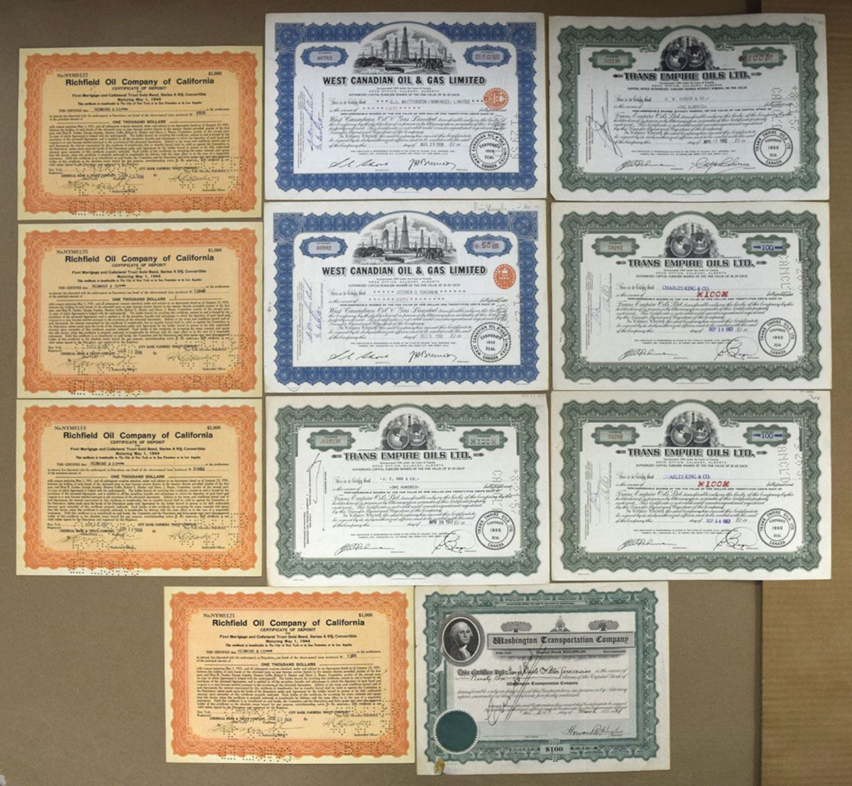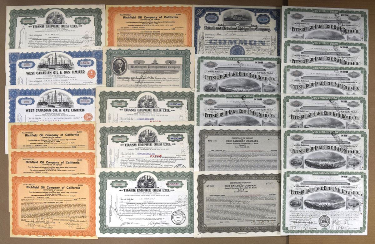 Lot of 20+ Issued Stocks and Bonds related to railroads, includes: Pittsburgh, Lake Erie Railroad Co., Trans Empire Oils Ltd., Canada, Richfield Oil Company of California, West Canadian Oil & Gas, Erie Railroad Company, Washington Transportation Company and more. Certificates range from Fine to VF condition. (20+). Sold "AS IS" no returns accepted.