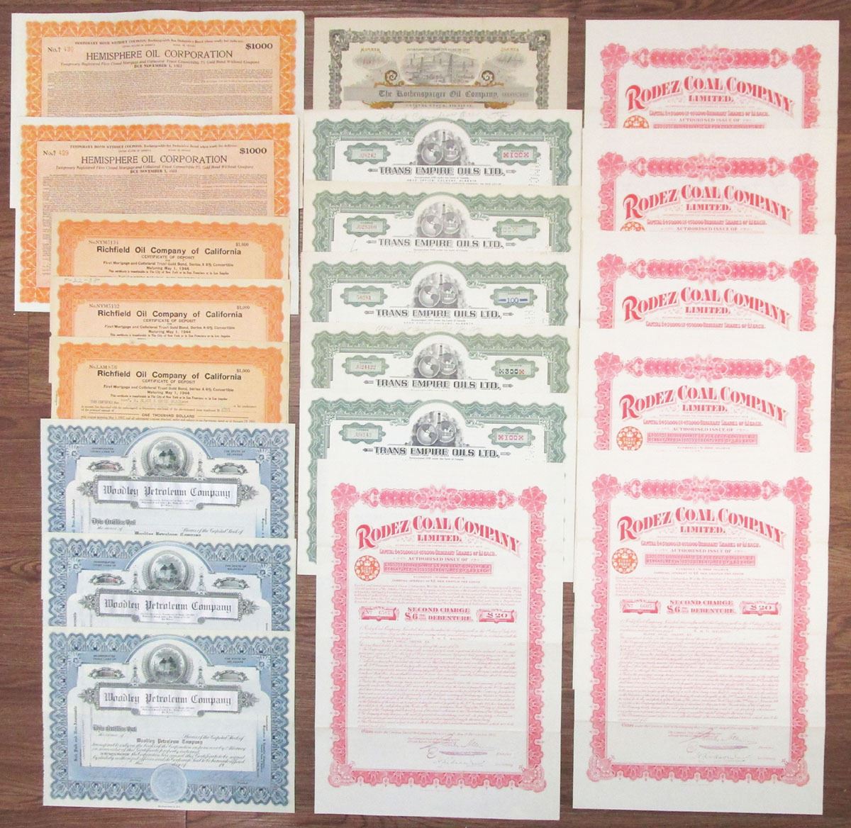 California....., Nevada, Ohio, Canada, United Kingdom, ca.1910-57. Lot of 20 Certificates, Includes: Woodley Petroleum Co. (3) Unissued Certificates; Richfield Oil Co. of California (3), I/C Bonds; Trans Empire Oils Ltd., (5), I/C Stock Certificates; Hemisphere Oil Corp., (2), I/U Bonds; Kochensparger Oil Co., I/C Stock Certificate; Rodez Coal Co. Ltd., (6), I/U Bonds. Items range from VF to VF+ condition. (20). Sold "AS IS" no returns accepted.