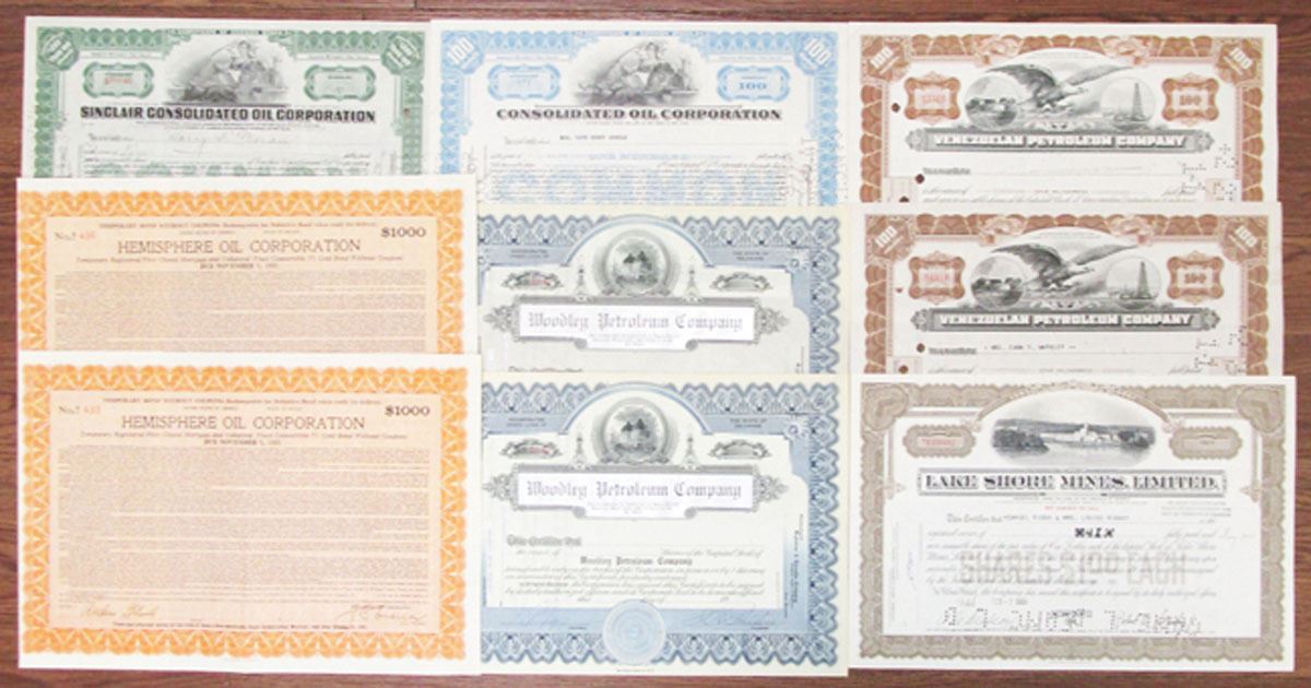 Canada..., New York, Delaware, & Nevada, ca.1921-69. Lot of 10 Stocks and Bonds, Includes: Sinclair Consolidated Oil Corp., 1921, 10 Shares I/C Certificate; Consolidated Oil Corp., 1932, 100 Shares I/C Certificate; Venezuelan Petroleum Co., 1941-54, 100 Shares I/C Certificate (2); Woodley Petroleum Co., ND (1920s), Unissued Stock Certificates (3); Lake Shore Mines, Ltd., 1969. 41 Shares Capital Stock I/C Certificate; Hemisphere Oil Corp., 1928, $1000 7% Registered Bonds (2). Condition range from Fine to XF. (10). Sold "AS IS" no returns accepted.