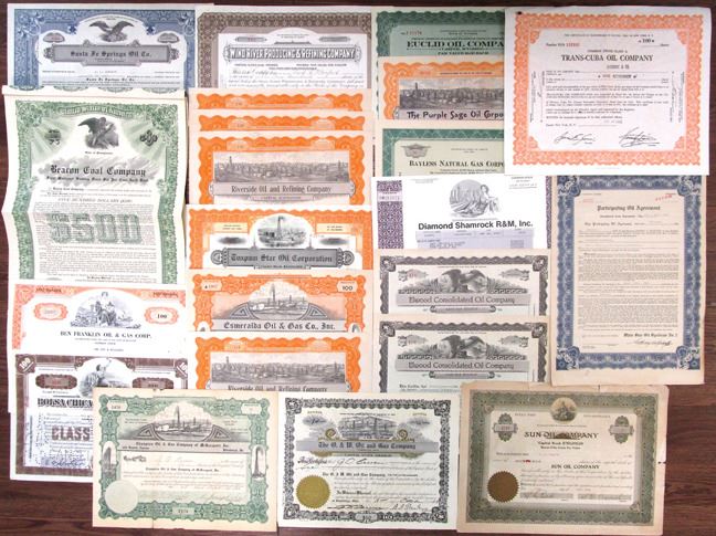 Nevada, Colorado, Maine, Ohio, and Various Issuers, 1917-87. Lot of 22 Stock and Bond Certificates, Highlights Include: Santa Fe Springs Oil Co; Ben Franklin Oil & Gas Corp; Bolsa Chica Oil Corp; Riverside Oil and Refining Co; and more. Items range from VF to Uncirculated condition. (22). Sold "AS IS" no returns accepted